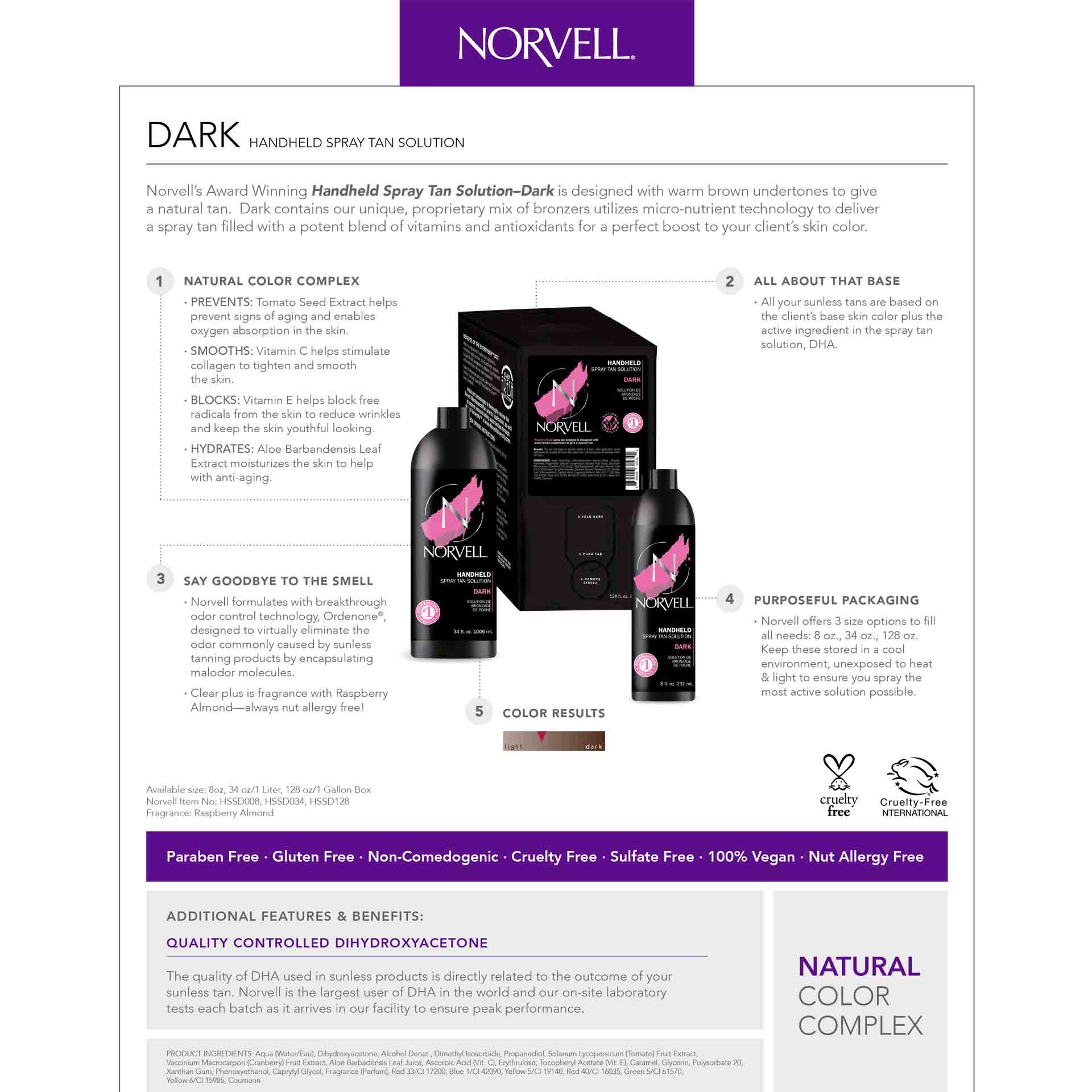 Norvell’s seven-time, award winning PREMIUM Sunless Solutions utilize micro-nutrient technology to deliver a potent blend of vitamins and antioxidants to boost the skin’s Just Off The Beach bronze. This formula works synergistically on all skin tones, creating a customized shade of bronze for each individual client. These rave-worthy, scented formulations are fragranced with allergen-free essence of raspberry and almond extracts. With 6 unique, Norvell blended shades to choose from - there is a solution for every client. After just one session, consumers will understand why Norvell is an acclaimed sunless tan.