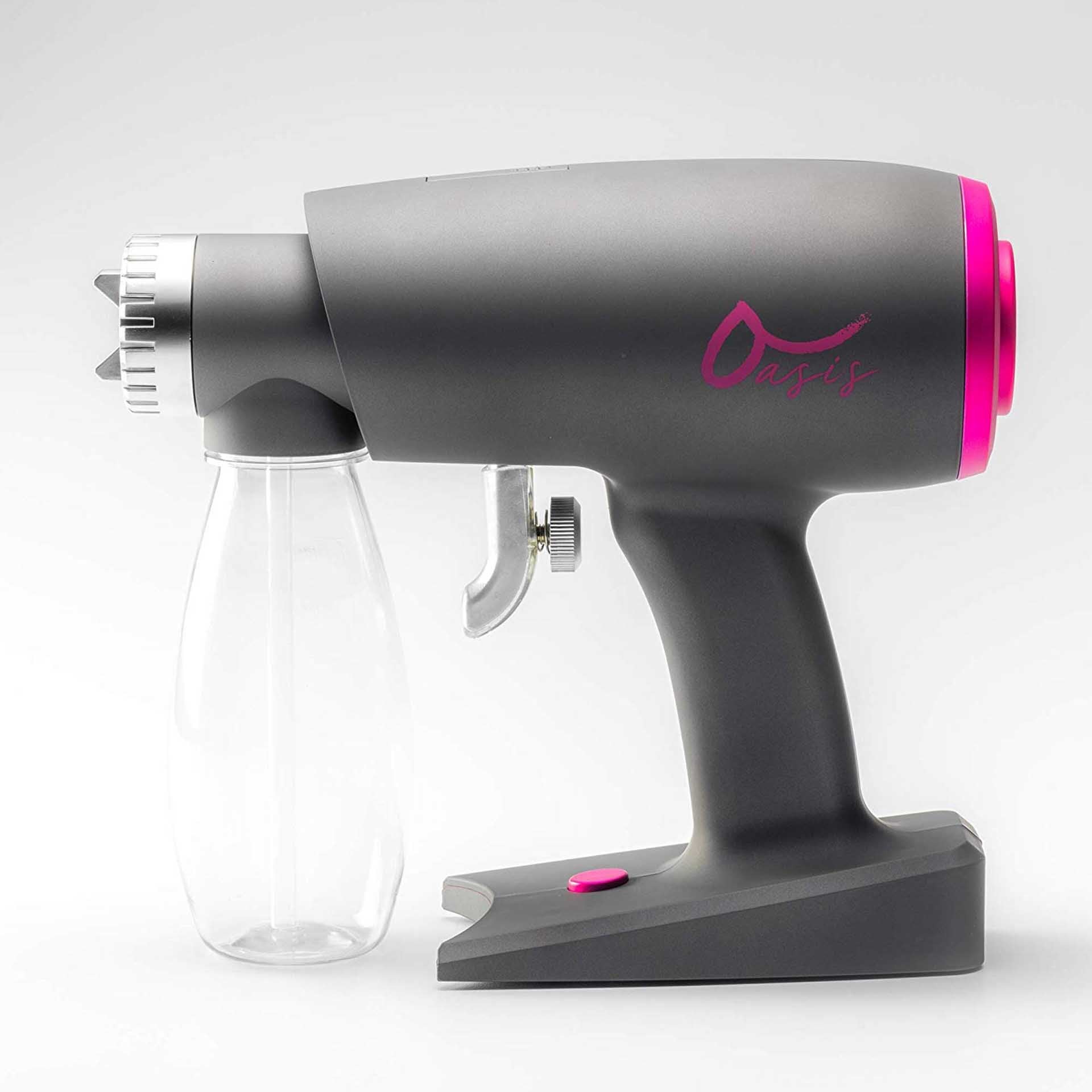 The FlexiMyst spray head is made to high standards and includes a horizontal and vertical fan spray patterns to maximum precision spray coverage in minimal time. The unit incorporates a precision stainless steel needle and nozzle to deliver precise solution atomization, non corrosive longevity, and durability. The Oasis utilizes the FlexiMyst removable spray head to provide the user flexible and easy cleaning. The easy to detach solution container also allows you to stage multiple solutions or to simply have a back-up if needed. Just release the latch and pop out to change solutions.