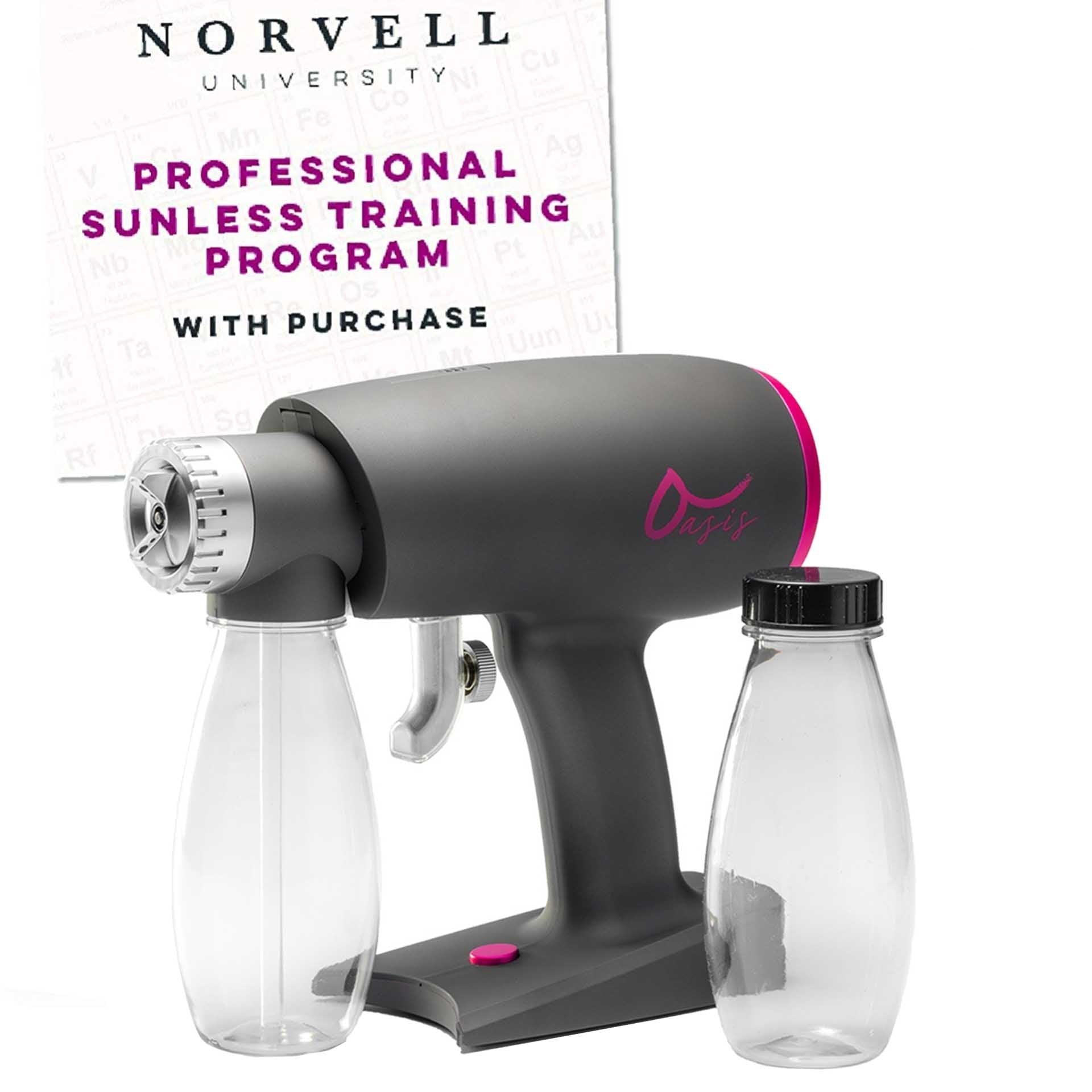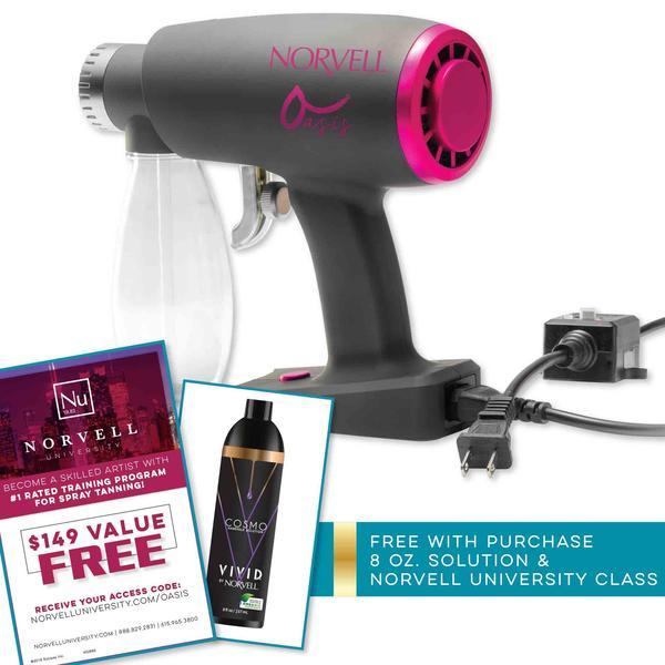 The Norvell Oasis Airbrush Spray Gun incorporates new technology to deliver great tans without a large investment. This unit is ultra compact, quite and amazingly affordable! The Norvell Oasis Airbrush system currently comes with complimentary access to Norvell University's online core sunless training in addition to Norvell's Cosmo based solution. This is a great package perfect for self tanners or new artists just getting started as well as expert operators looking for a small handy back up unit.